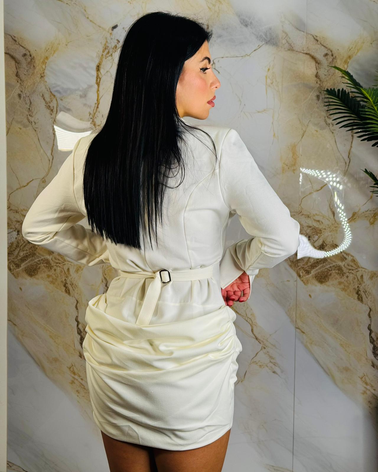 Mini dress con cinturino regolabile in vita sul retro, veste fino ad una 44, disponibile in panna, bordeaux, marrone e nero.