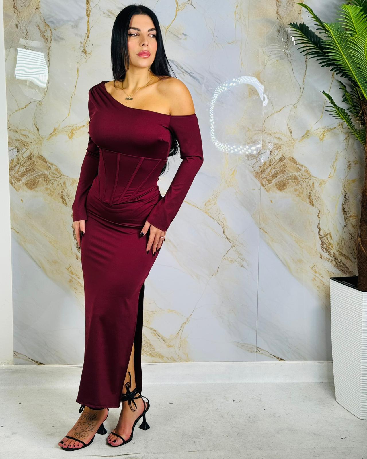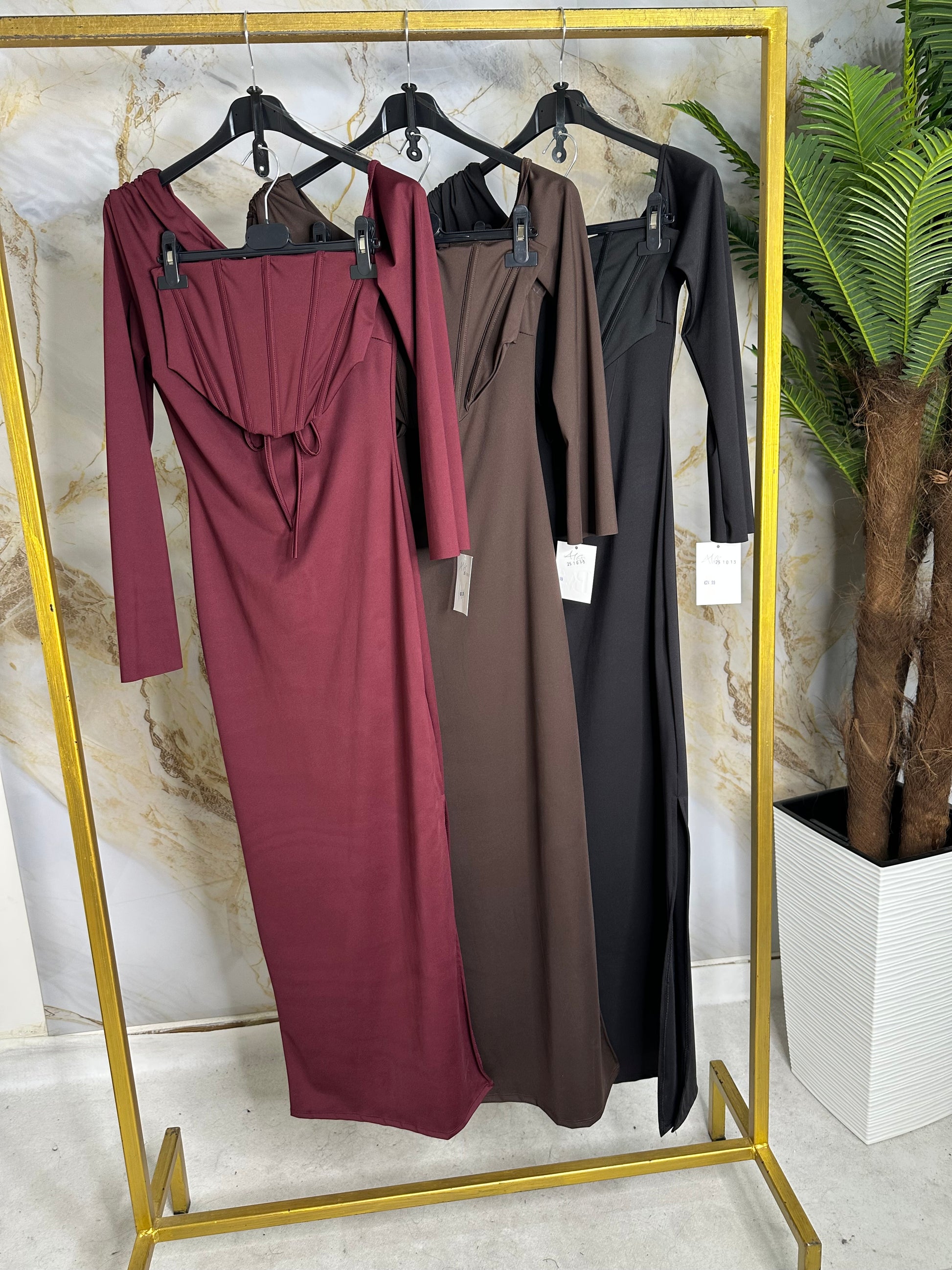 Long dress in lycra top quality con busciere, veste fino ad una 44, disponibile in bordeaux, marrone e nero.