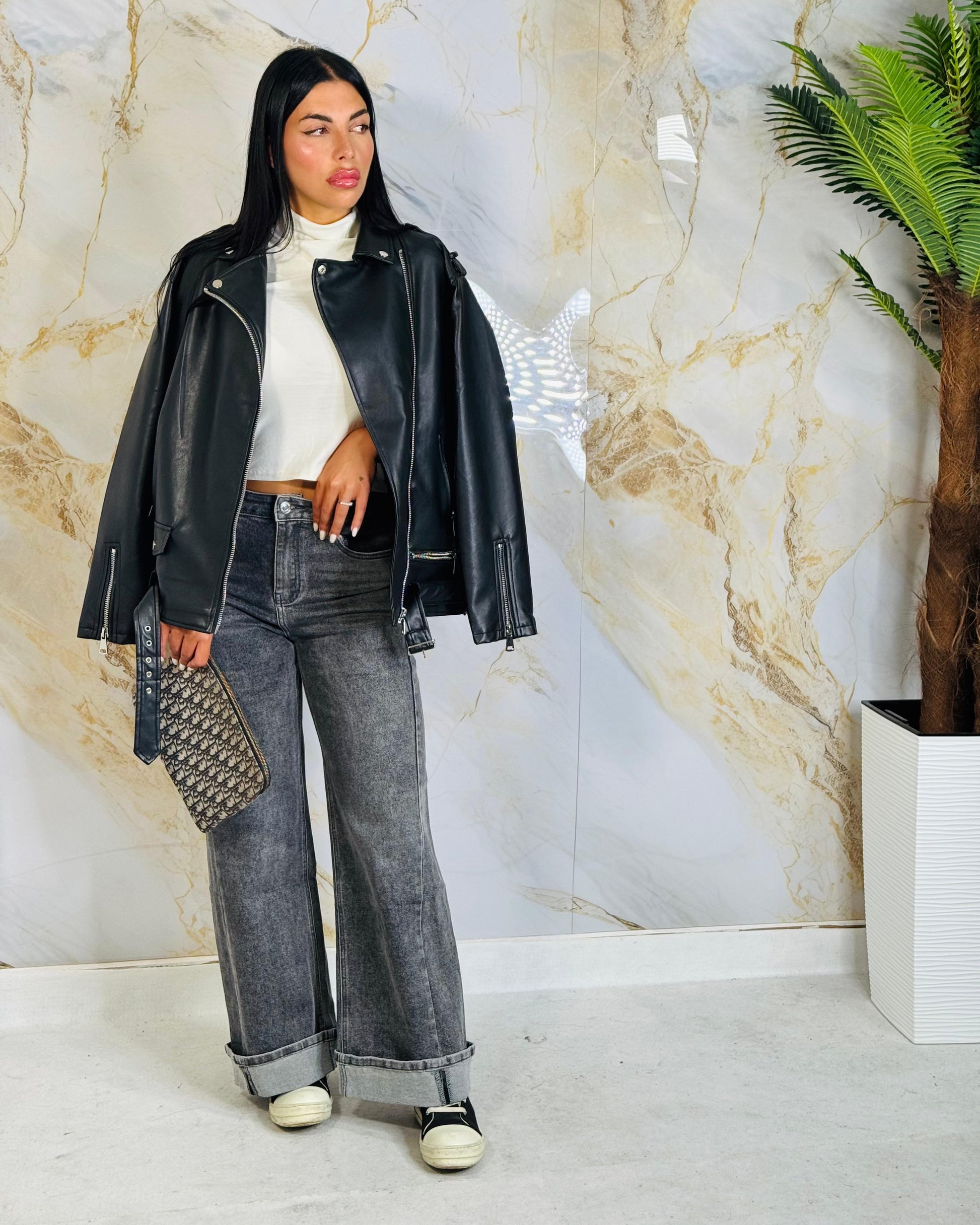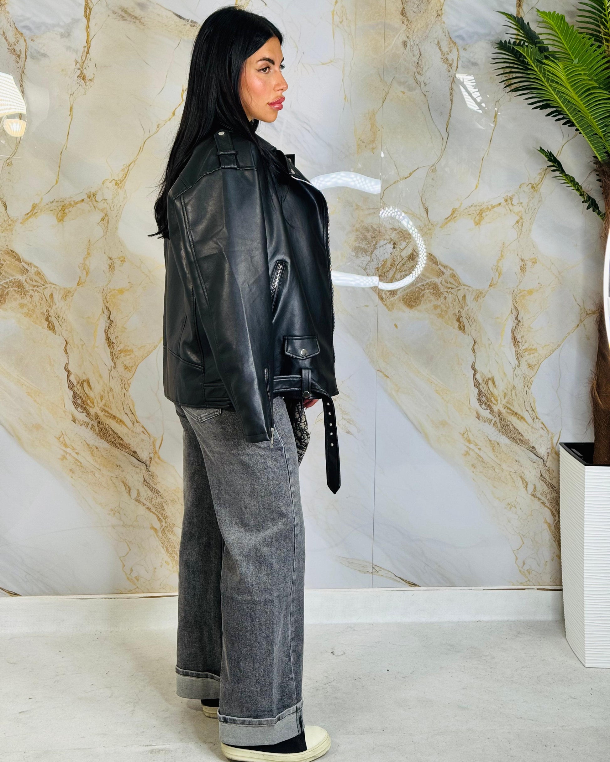 Biker oversize ecopelle, vestibilità regolare, la modella in foto veste L/XL.