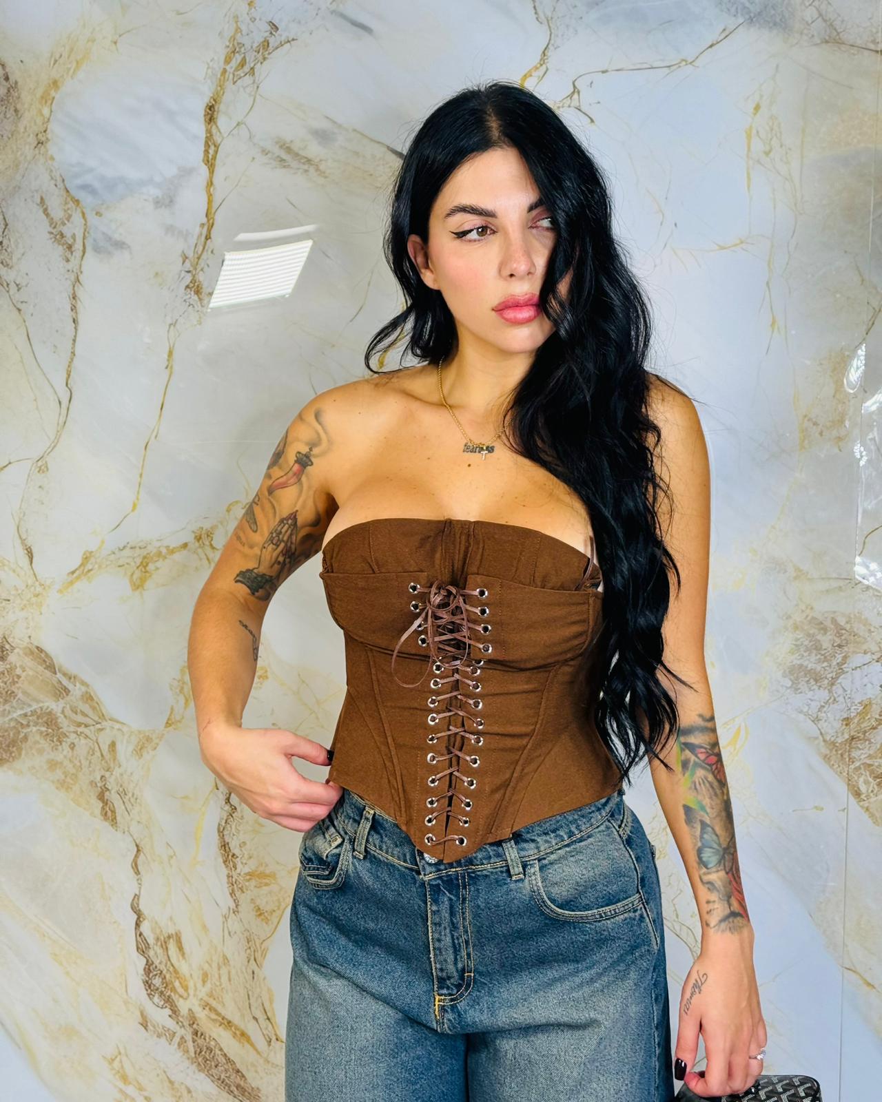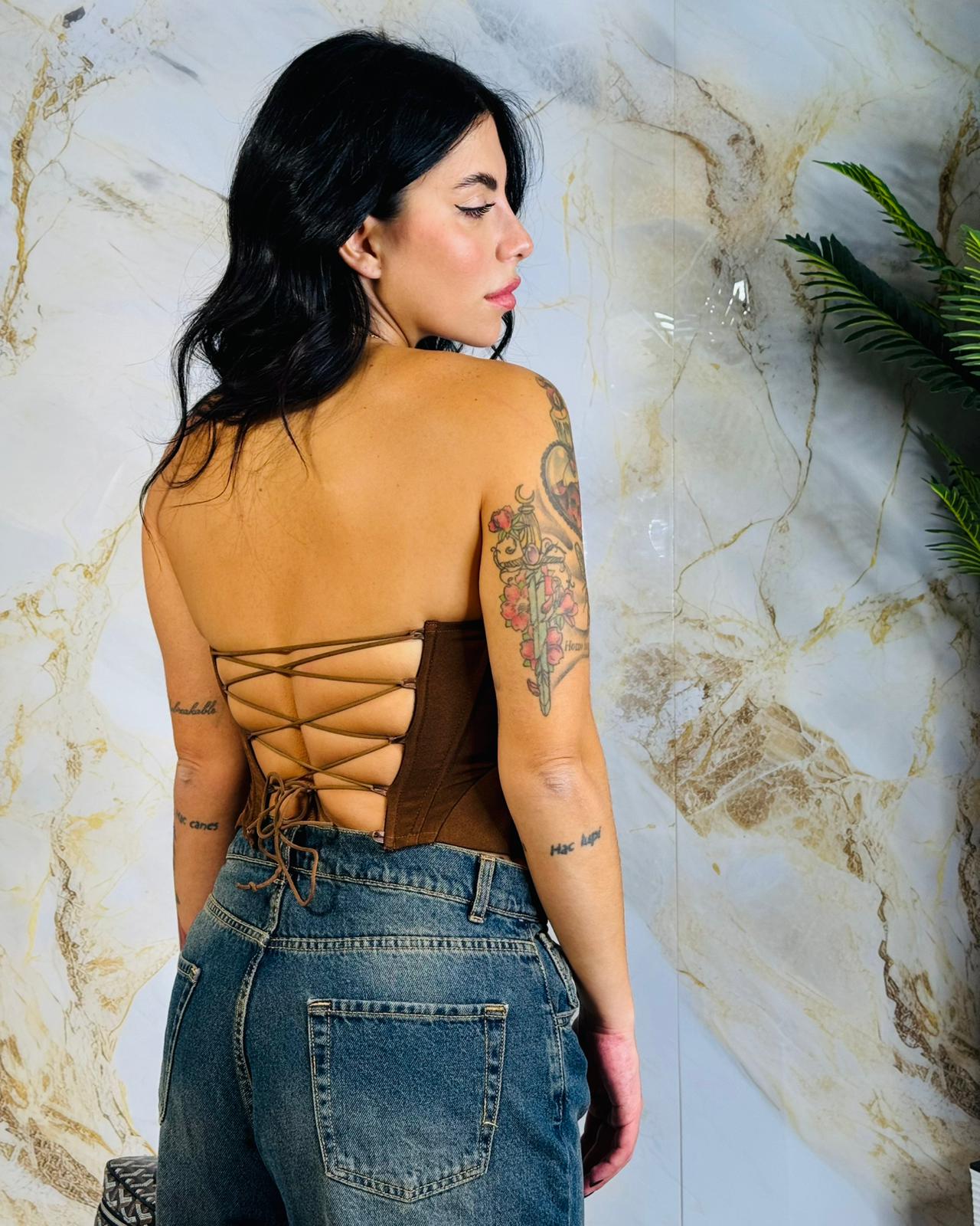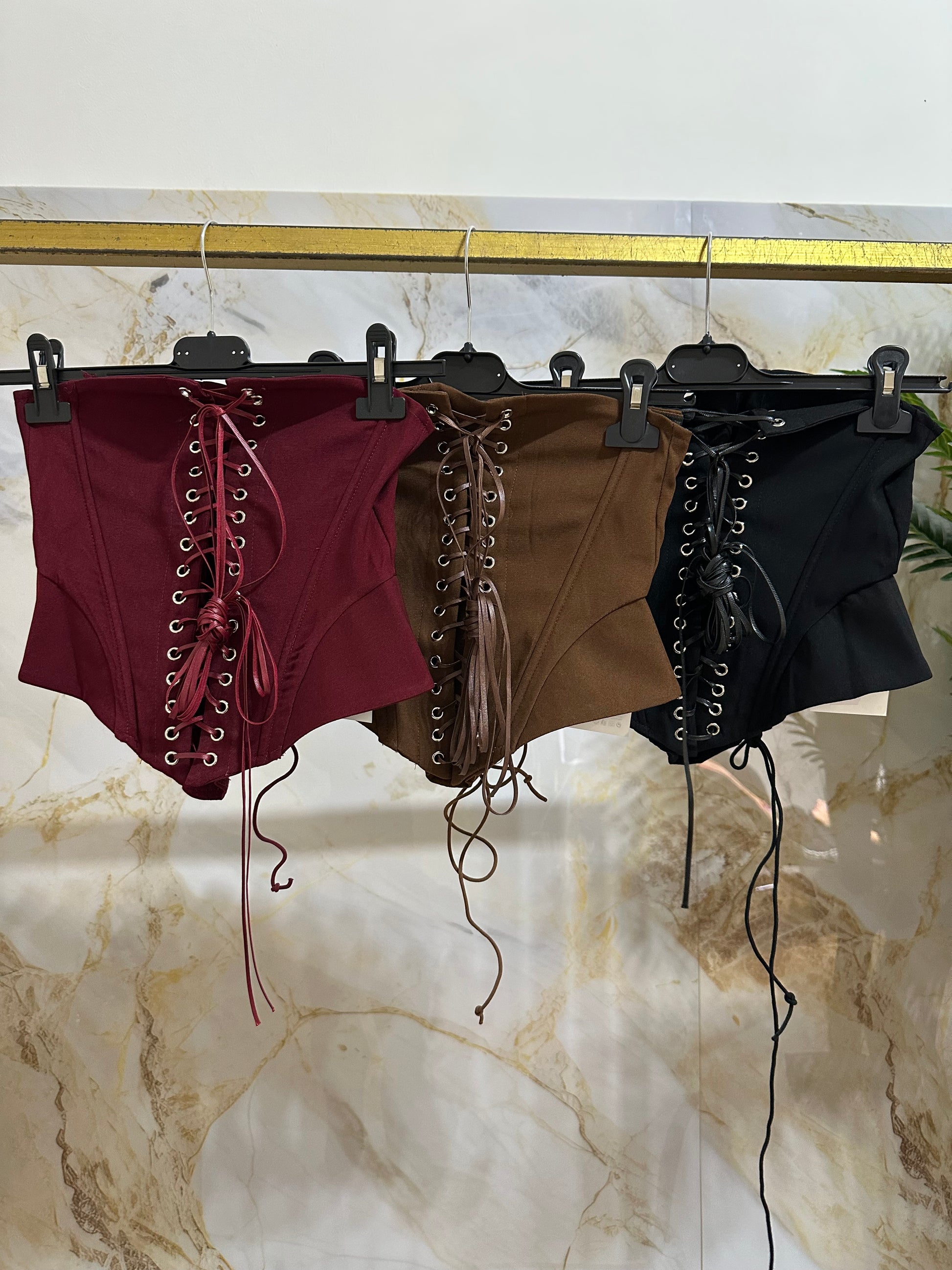 Corpetto/bustier con stringhe regolabili, veste fino ad una 44, disponibile in bordeaux, marrone e nero.