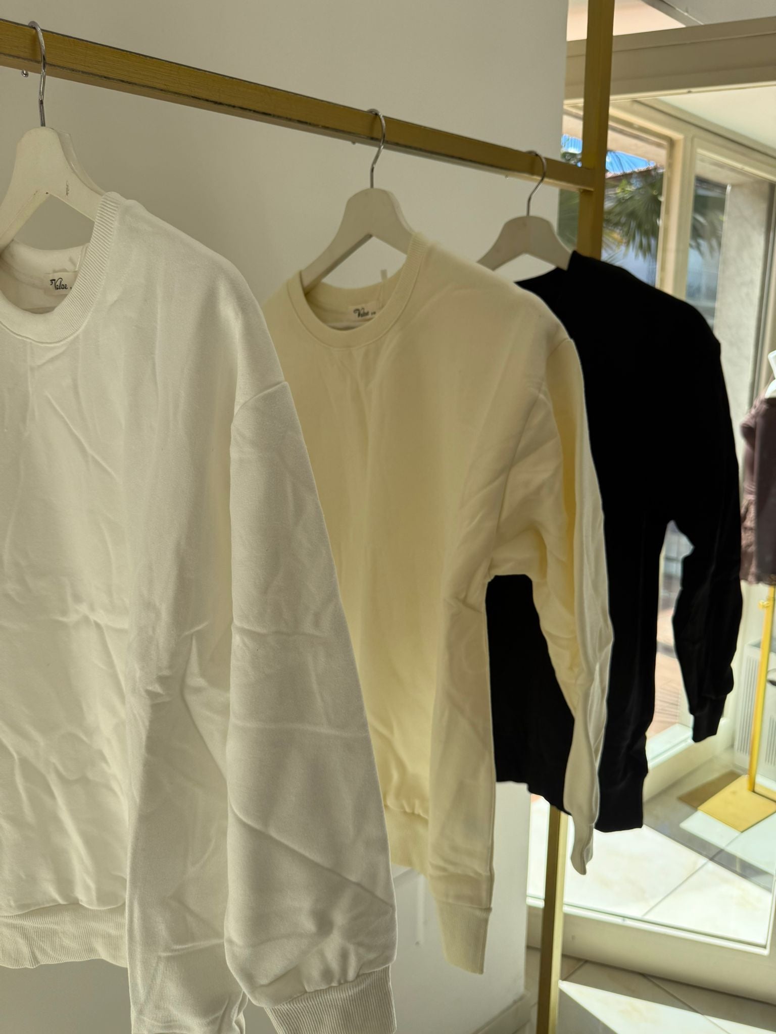 Felpa basic oversize felpata, vestibilità regolare, disponibile in bianco, panna e nero.